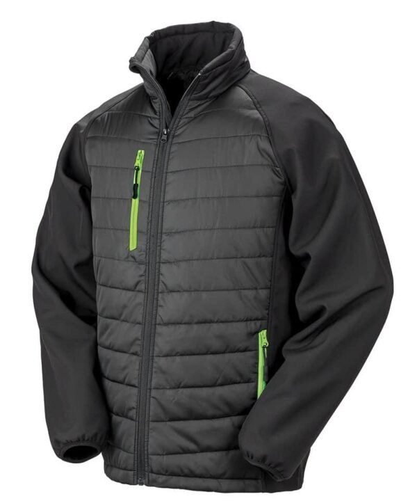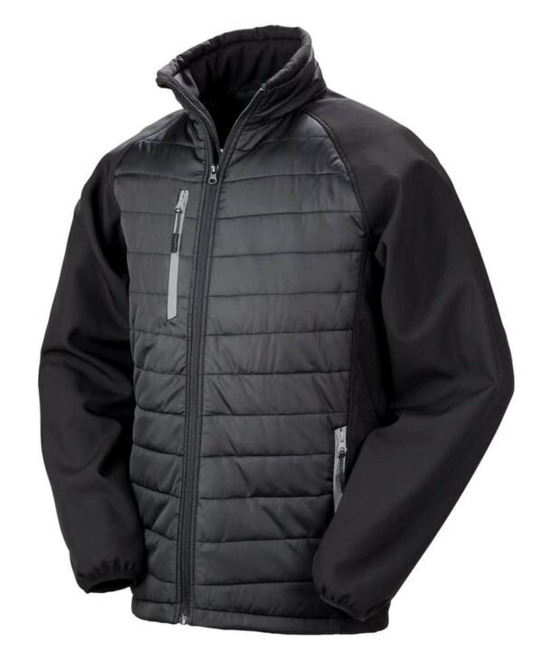 On-trend padded plus softshell combination. Supersoft, lightweight and warm. Printable softshell sleeves. Ready to brand. Quiet to wear. Contrast colour pocket zips. Full front zip with chin guard. Stand-up padded collar. Padded body. Soft bound cuff. Black zip pulls. Hangtag.